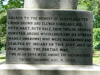 A few days after the incident, the teacher and children were buried together in one grave, which was not marked. As years passed, the story was forgotten and became a whisper or rumor of the past. Seventy five years after the massacre, a committee of responsible citizens of the area conducted a dig in the wooded area hoping to prove that there was indeed a burial. With a little luck the grave was found on the first excavation. However, no further action was taken for forty years when, while in a Centennial Convention meeting, a committee was formed to create the Enoch Brown Park and Monument Committee.